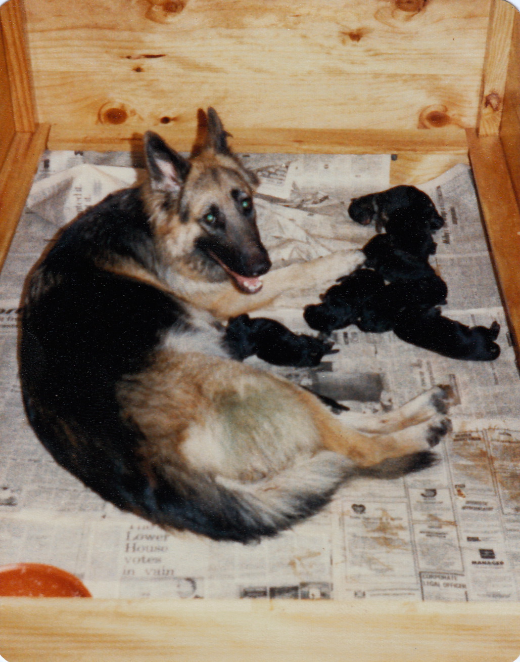 Then the long wait to see if pregnancy had happened. The gestation time was 9 weeks and it usually isn’t possible to tell before 5 weeks whether the bitch is pregnant. So we took her to the vet and found out that puppies would be due in six weeks. We had the whelping box. We had our kennel name “Mathburn” approved so all we had to do was wait.