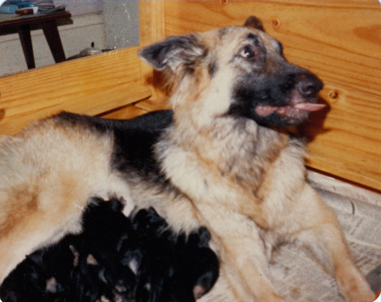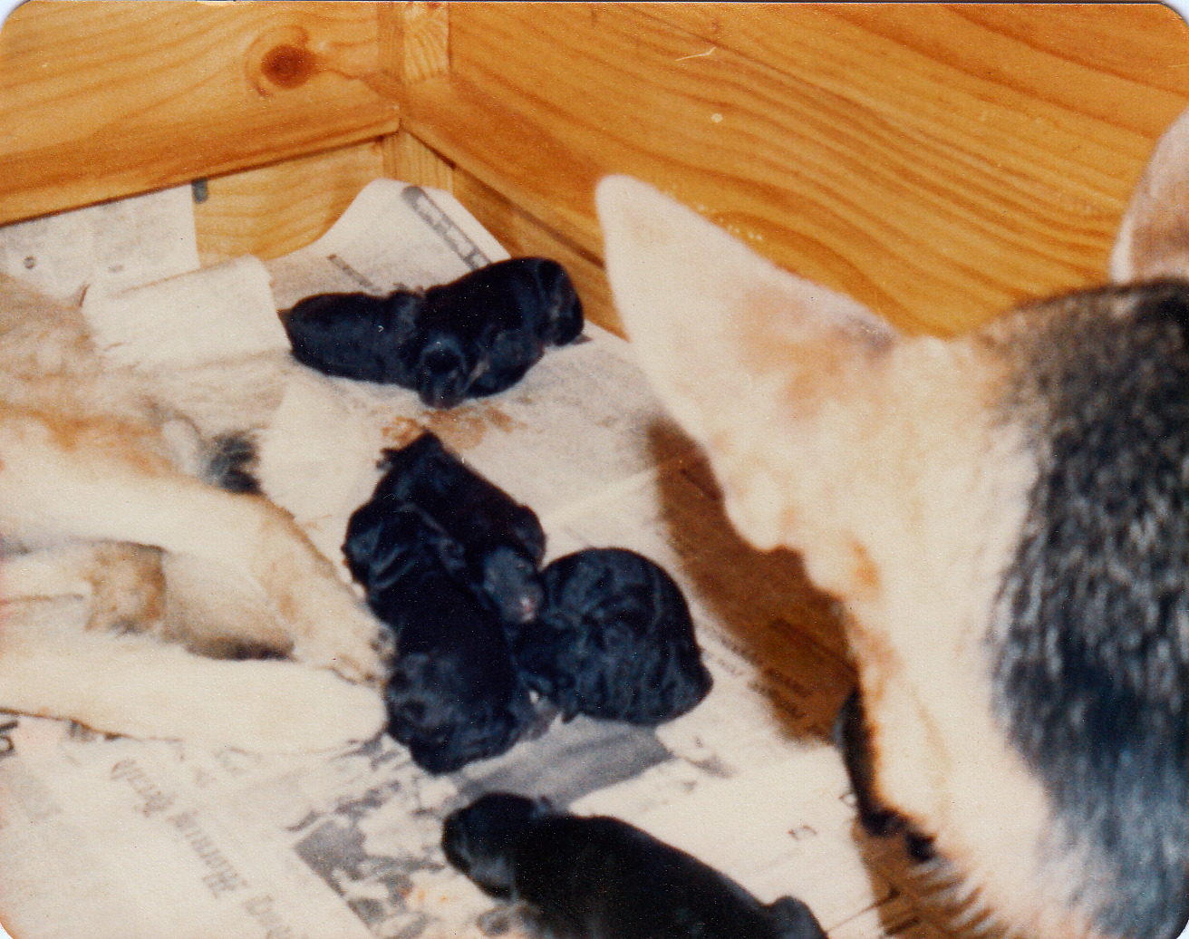 When the time came she refused to get in the whelping box. She wanted to have those puppies on the bean bag and she wanted that bean bag beside the bed. She dragged it from the lounge room and then spent a long time walking around in circles in one direction and then repeating the procedure walking the other direction, on the bean bag. She couldn’t settle. Then the first puppy was born. It was the first time I had seen the birth of anything. I don’t know how I missed out in my nursing training but watching this birth I could understand for the first time how my friends had found the witnessing of their first human births. A wonderful experience, eight times over a couple of hours. She was a wonderful mother removing them from their membraneous sacs and cleaning and warming them, eating the afterbirth. A messy business and the bean bag was never used again.