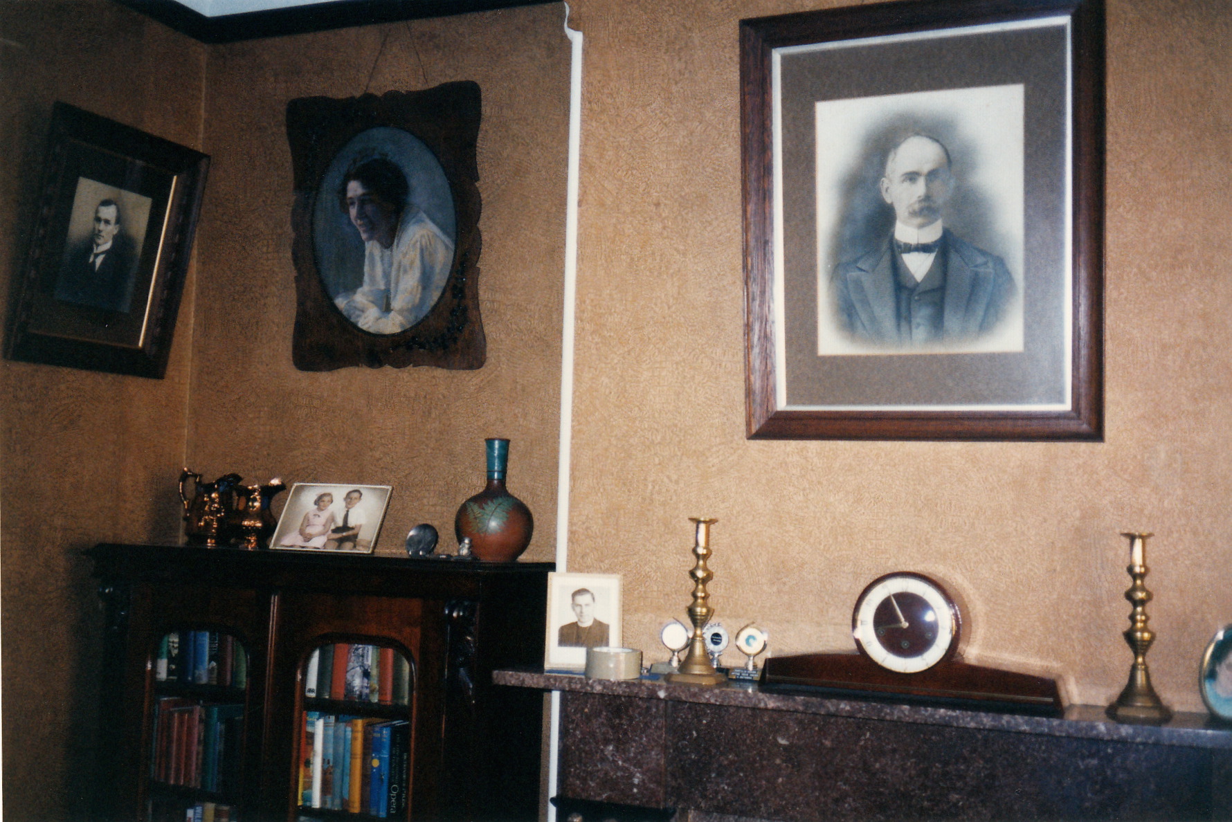 One of the most important rooms in the house was the library. Each available wall had a family portrait hanging. The picture on the right is my Great Grandfather, Great-Aunty Mary in the middle and Great-Uncle John on the left. On the mantlepiece is my father and on the small bookcase a studio portrait of my brother and I. Many generations of the family hanging together.