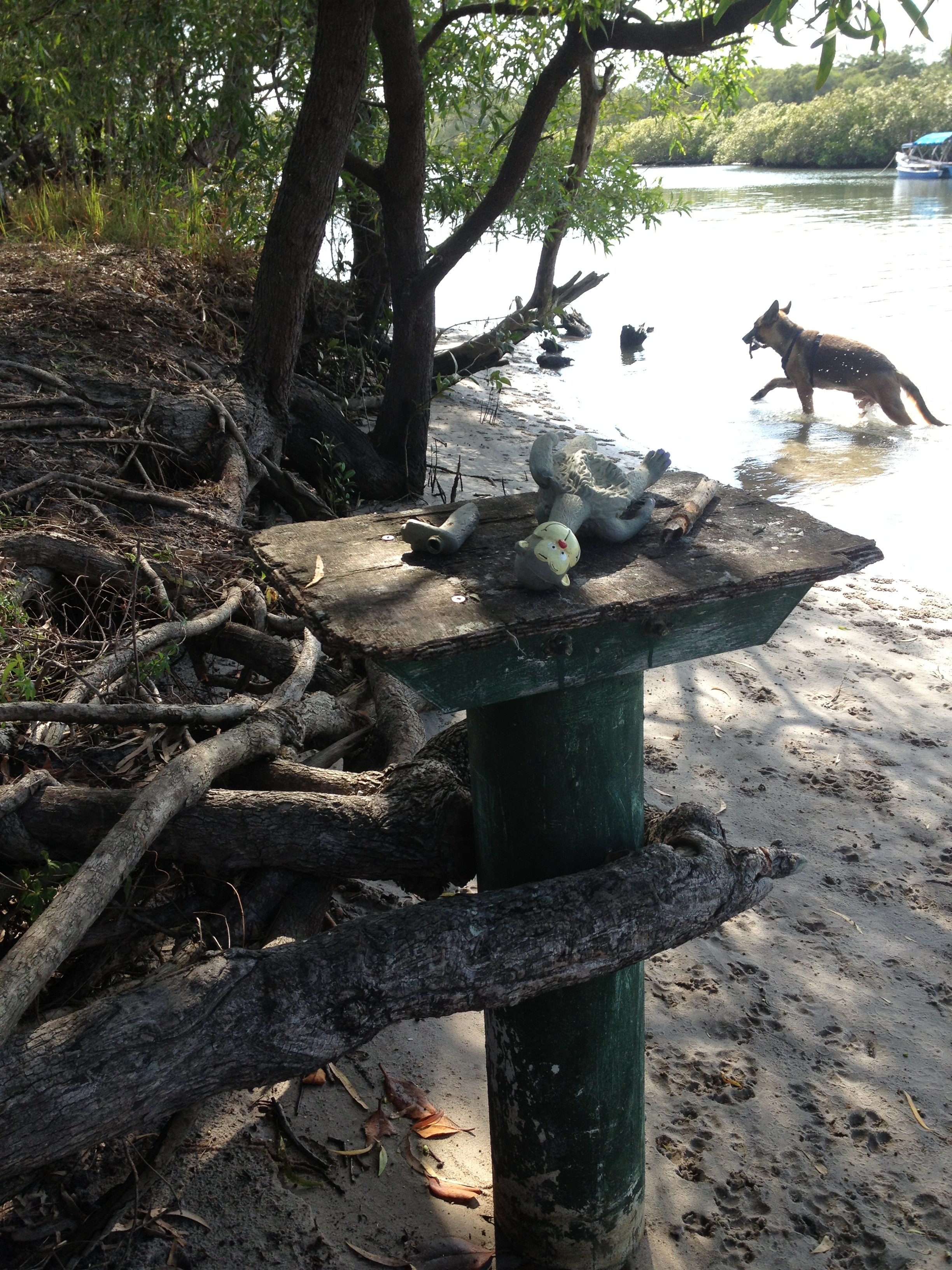This was my best photo of the week because it had all my favourite elements in it. Firstly there is my tranquil section of the river. I am happier without the boat as it makes the river look busier. It went today. Then there is Zach my german shepherd dog with stick in mouth – his favourite pastime particularly in this hot weather. But the item which I particularly liked was unexpected; the stand with the monkey on it. I have walked this stretch of the river every day, at least once per day and often more, for the last two years . I often stop at this beach to throw sticks and let Zach swim. Never have I seen this stand. I love the way the tree roots have wrapped around it as though to hold it in position. To stop it washing away in floods and high tides. The monkey, one of my favourite animals, sitting atop it. Its stomach squashed. Was it a child’s toy or perhaps a dog’s squeaky plaything? The photo was taken with iPhone 4s no editing.