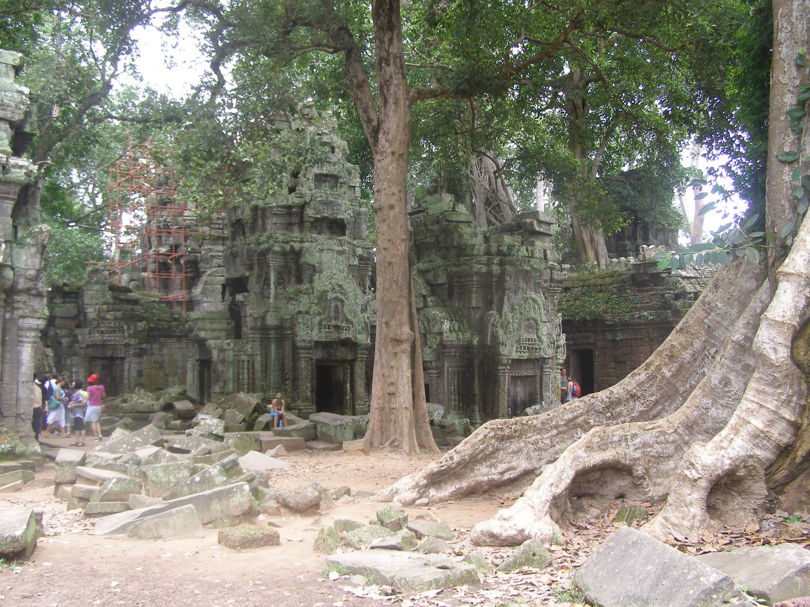 Any photographs I take of places such as Ta Prohm Temple in Cambodia (where a scene from Raiders of the Lost Ark was filmed) I avoid having people in the frame. I like to feel as though I was the only person there. This means arriving before the crowds or after they have left. Here they are departing and future photos of this area are devoid of people. The people however are not the extras in this photograph but rather the red scaffolding which does not add to the photo but that I admit at the time I did not notice as the ancient buildings and trees took all my attention.