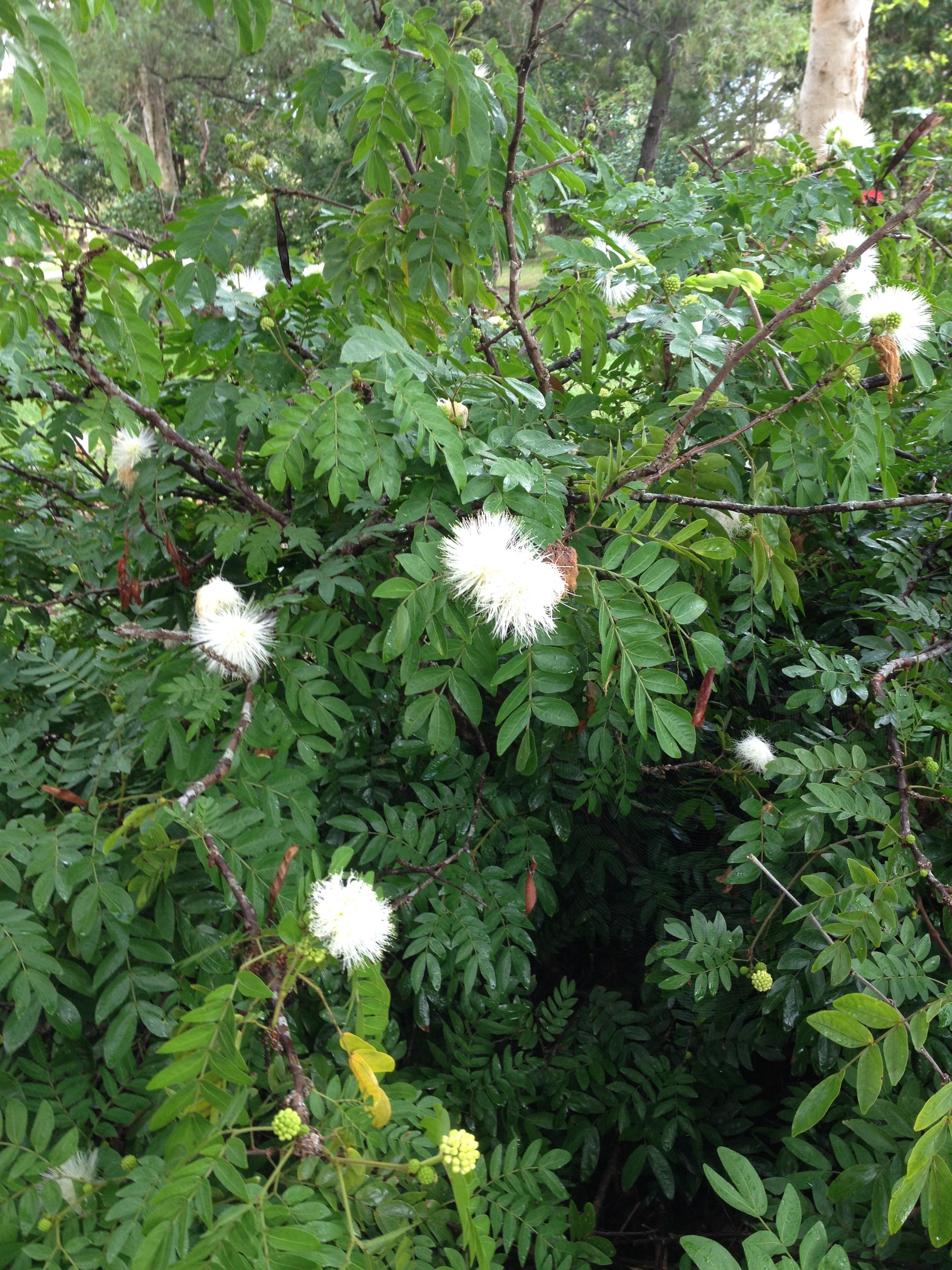 Joann someone has kindly told me that it is a CALLIANDRA HAEMATOCEPHALA ‘ALBA’ White Powder Puff. Cheers Irene