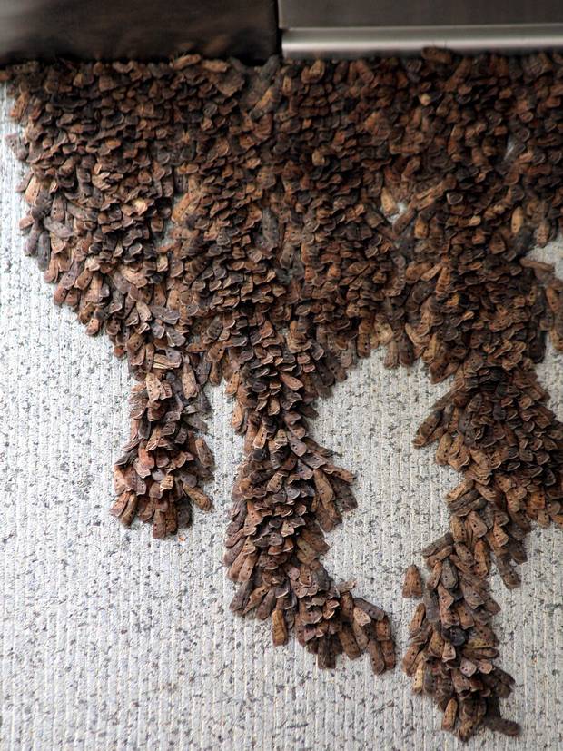 For cities in the flight path of these moths problems arise for both the city and the moths. As the moths fly at night the city lights fool them into thinking the sun is coming up and they will attempt to find a dark place to rest and in the type of numbers entire walls of buildings can be hidden by the moths covering its surface.