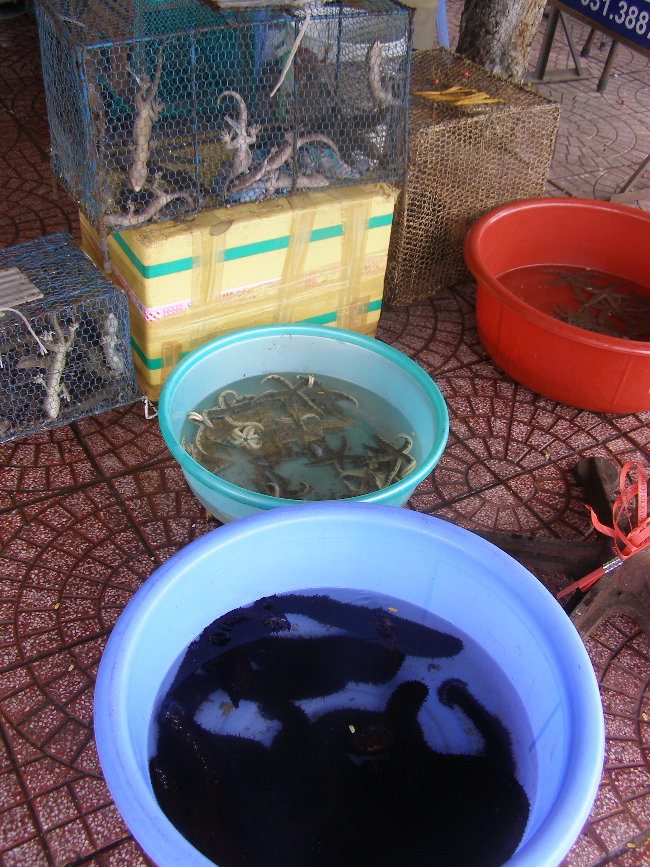 In France containers for food and items with which one cooks are more than attractively contained. The markets have the food presented in beautiful woven baskets and these oils and vinegars are artistic enough to want to display them to look at. It is a different matter in Vietnam where the only French influence is in some cooking techniques. Many of the animals are sold live in containers that I would normally use for the laundry or for my dog’s drinking water.