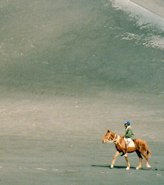 Caught as the tidal wave came in… No just joking. It is a volcano, black because of the ash it spews out and the area the chap is riding on is the ash plain. My husband got caught on it one day in torrential rain and the water off the volcano was massive and his jeep sank til all four axles were covered in sludge.