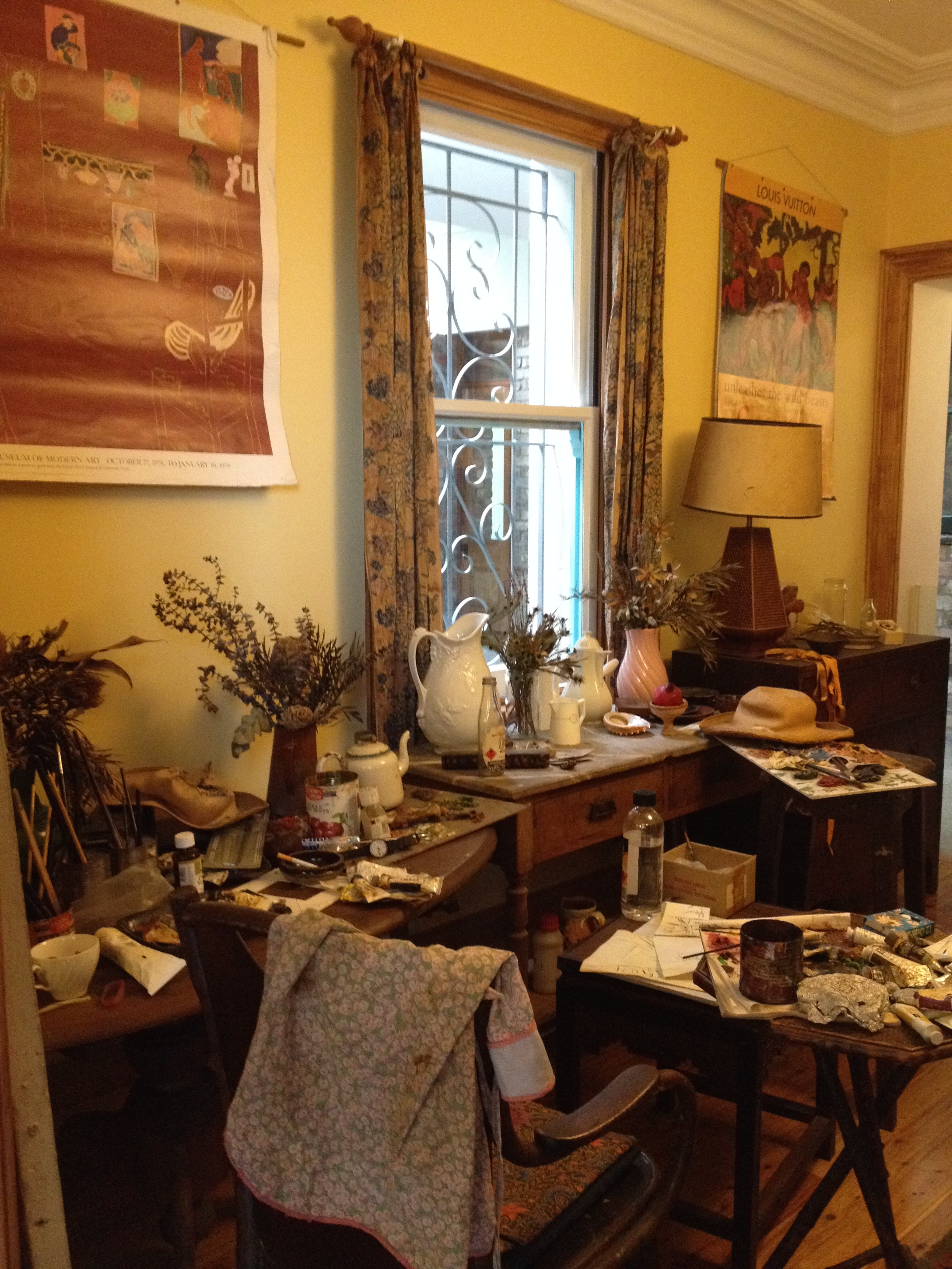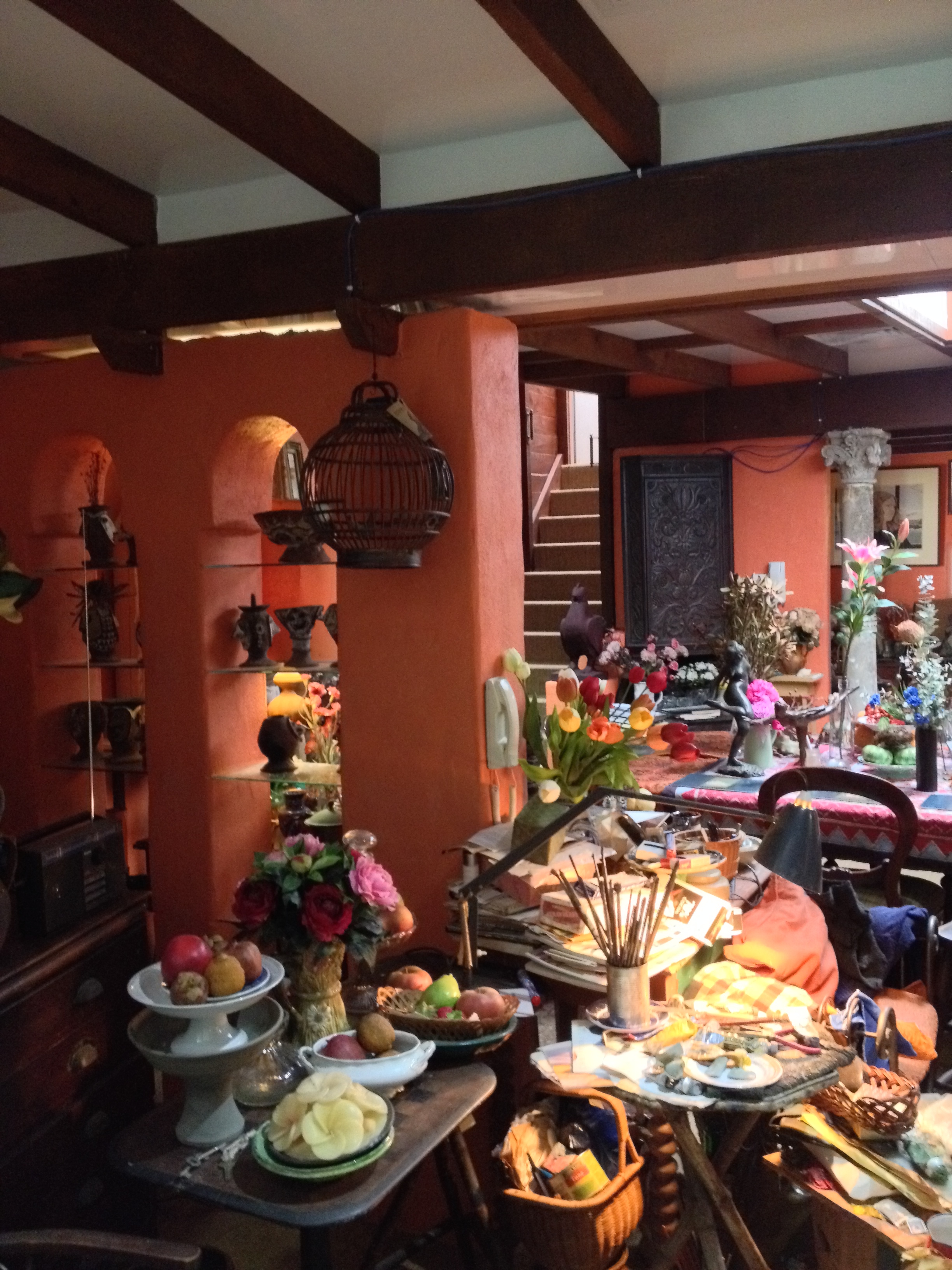 When I first saw the interior shot, despite the clutter I recognized the painstaking placement of all the things. Some people have that knack. My husband, is simply cluttered! I’m not a hoarder, but I’m an arranger–everything has it’s place or it’s gone. Such an interesting profile of an artist to go with the photos.