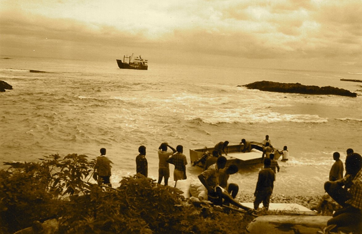 After the first cyclone the wharf, built by the Japanese was badly damaged. An island without a wharf becomes isolated, cut off from not only conveniences but life staples. Everything apart from wonderful seafood, seasonal produce and scrawny chickens had to imported. 44 gallon drums of fuel, sacks of rice and the floorboards (photo) for the house we were building came in via the dinghy which went out to the inter-island trader The Saraika. This shipment arrived unscathed. It was another story, however, when or four-wheel drive Isuzu dual cab made the journey.