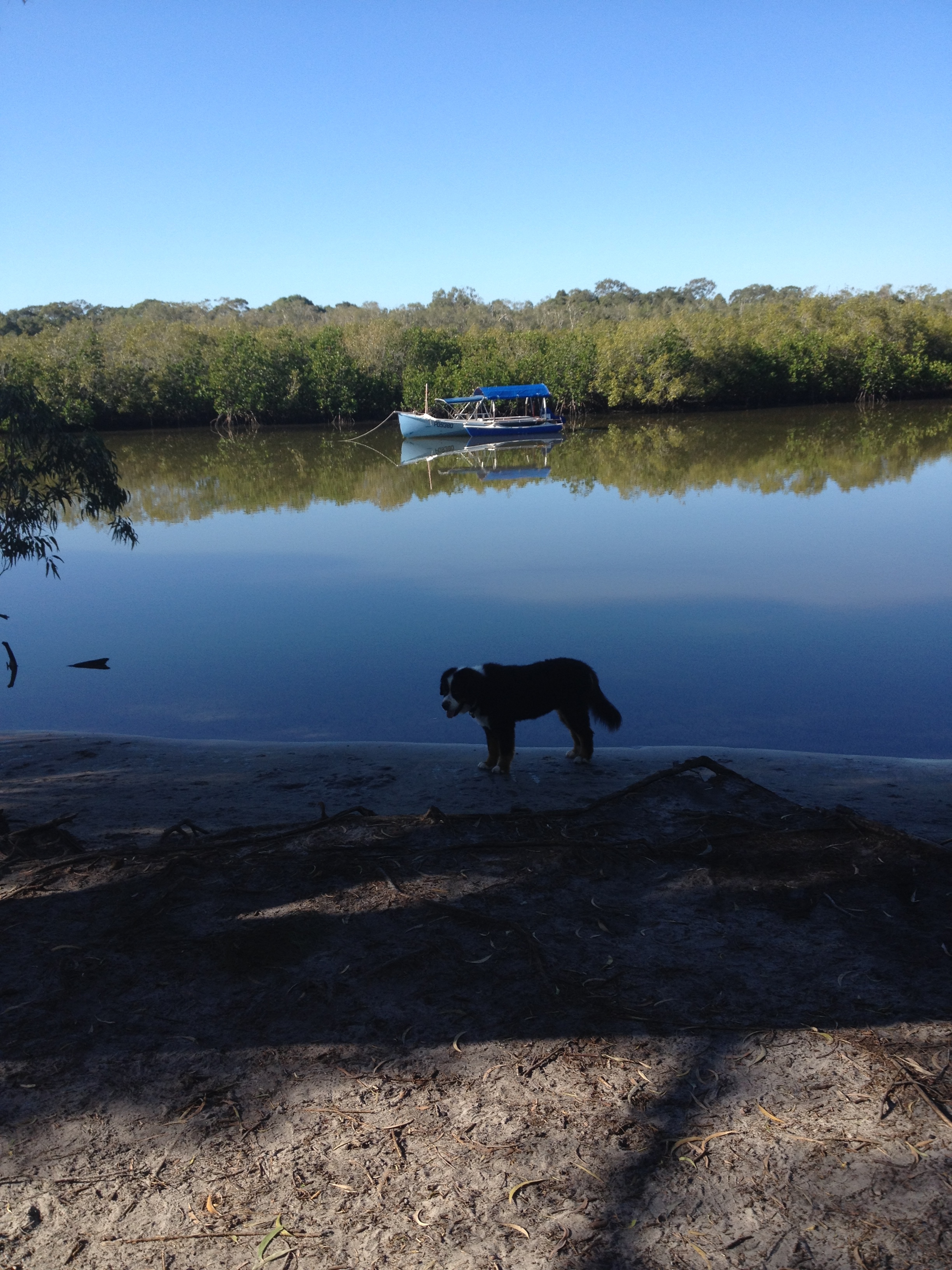 Smart dog! Shade and water nearly – he looks hot!