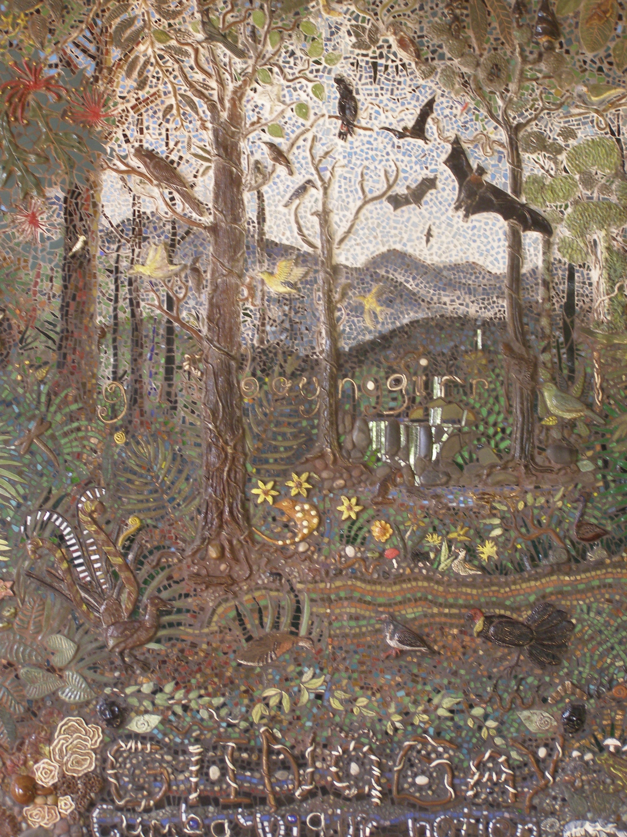 This large mosaic is found at the National Park information centre at Dorrigo in NSW. It is of the aboriginal dreaming and aboriginal stories. Just superb and this is only part of the long wall.
