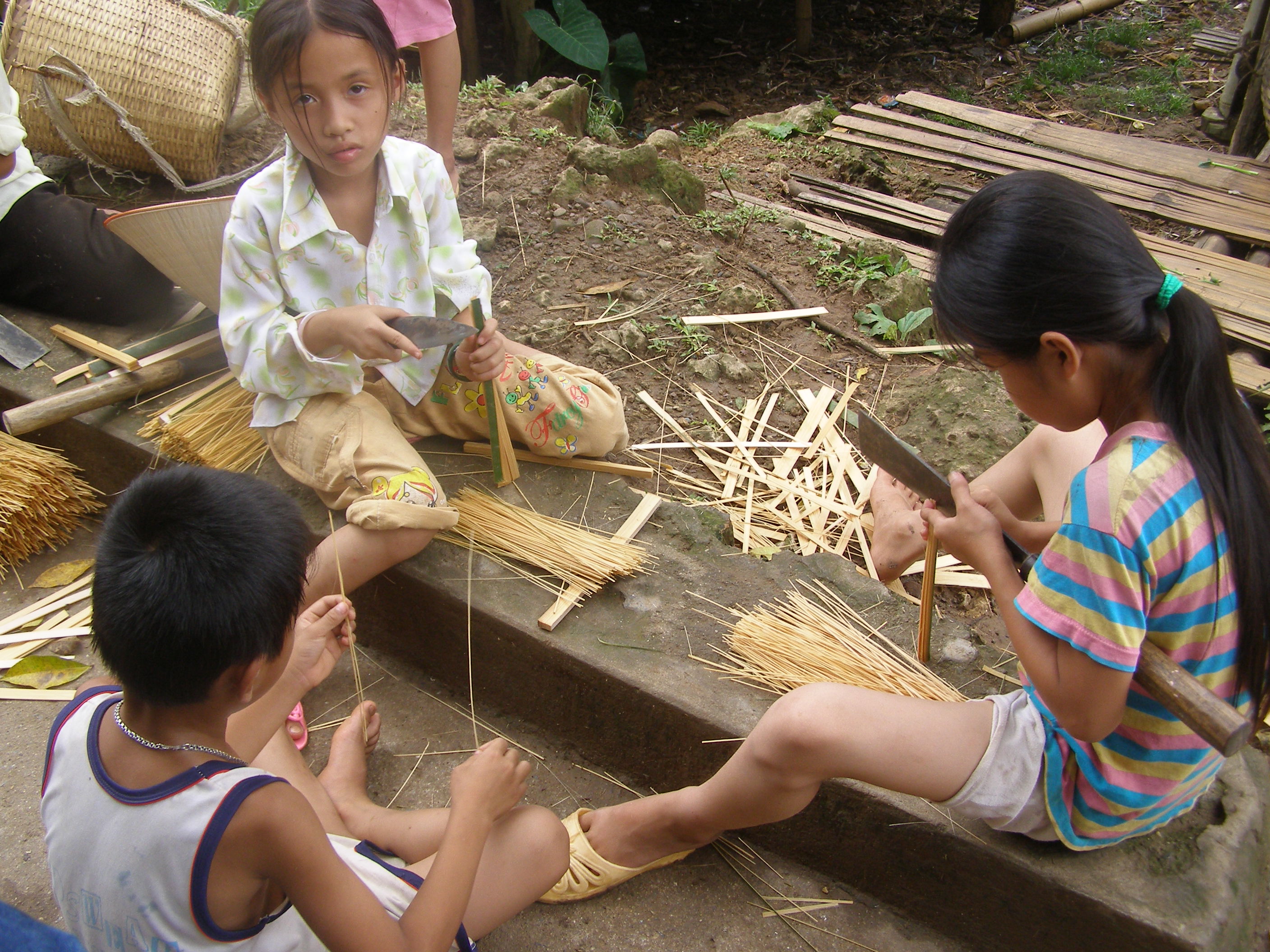 They are chopping either bamboo or rattan. I knew at the time what they were cutting it for but now I can only guess it was for weaving.