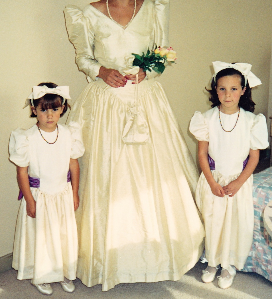 My clever mother made the bride dress and also the two flower girl dresses from a pattern.