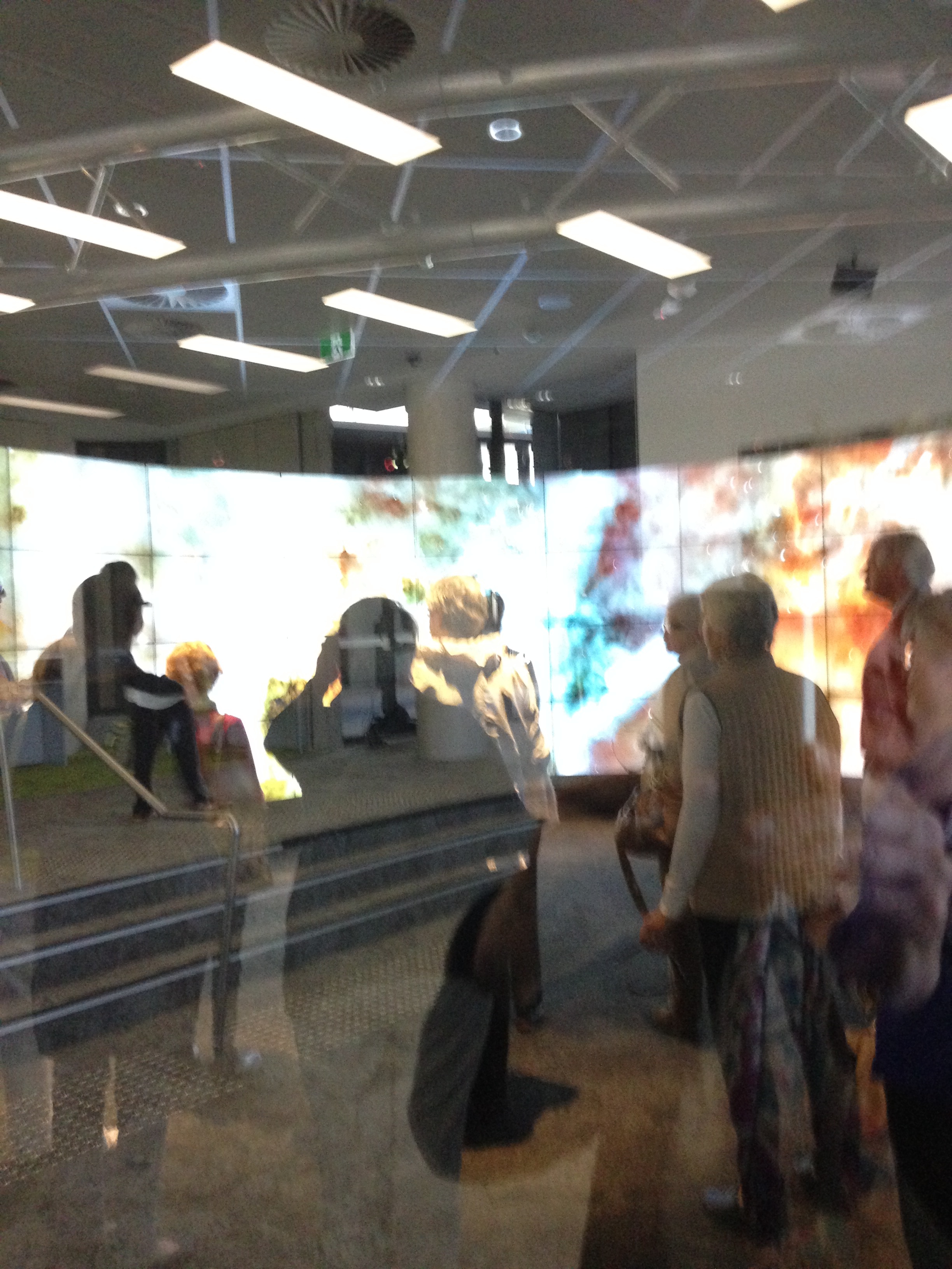 Only 15 people are allowed inside at the one time and if you suffer from vertigo or epilepsy the area is off-limits. We stood in the middle surrounded by the 20 screens. Initially we saw 2D images. The quality and definition were amazing. Different screens could be shown at the same time allowing students to return to a screen, unlike seeing the slide for a short time and then its gone. Then we put on our three D glasses and found ourselves whisked off to Cameroon where we drove through the village, inspected inside their houses, visited the market and toilet arrangements. This gives the student the experience of being there and they can gain greater understanding of the limitations of their projects, see what really needs attention and so much more.