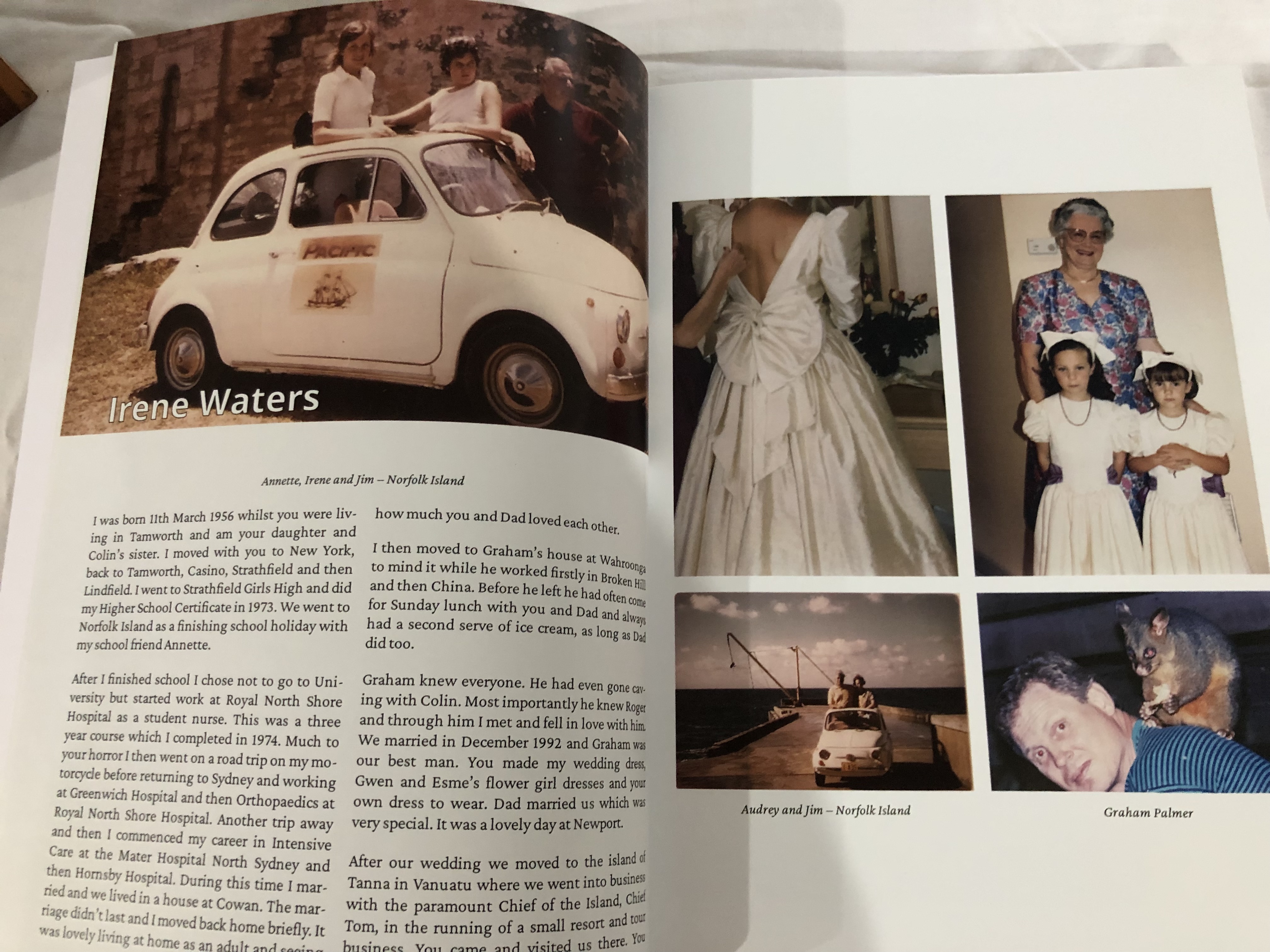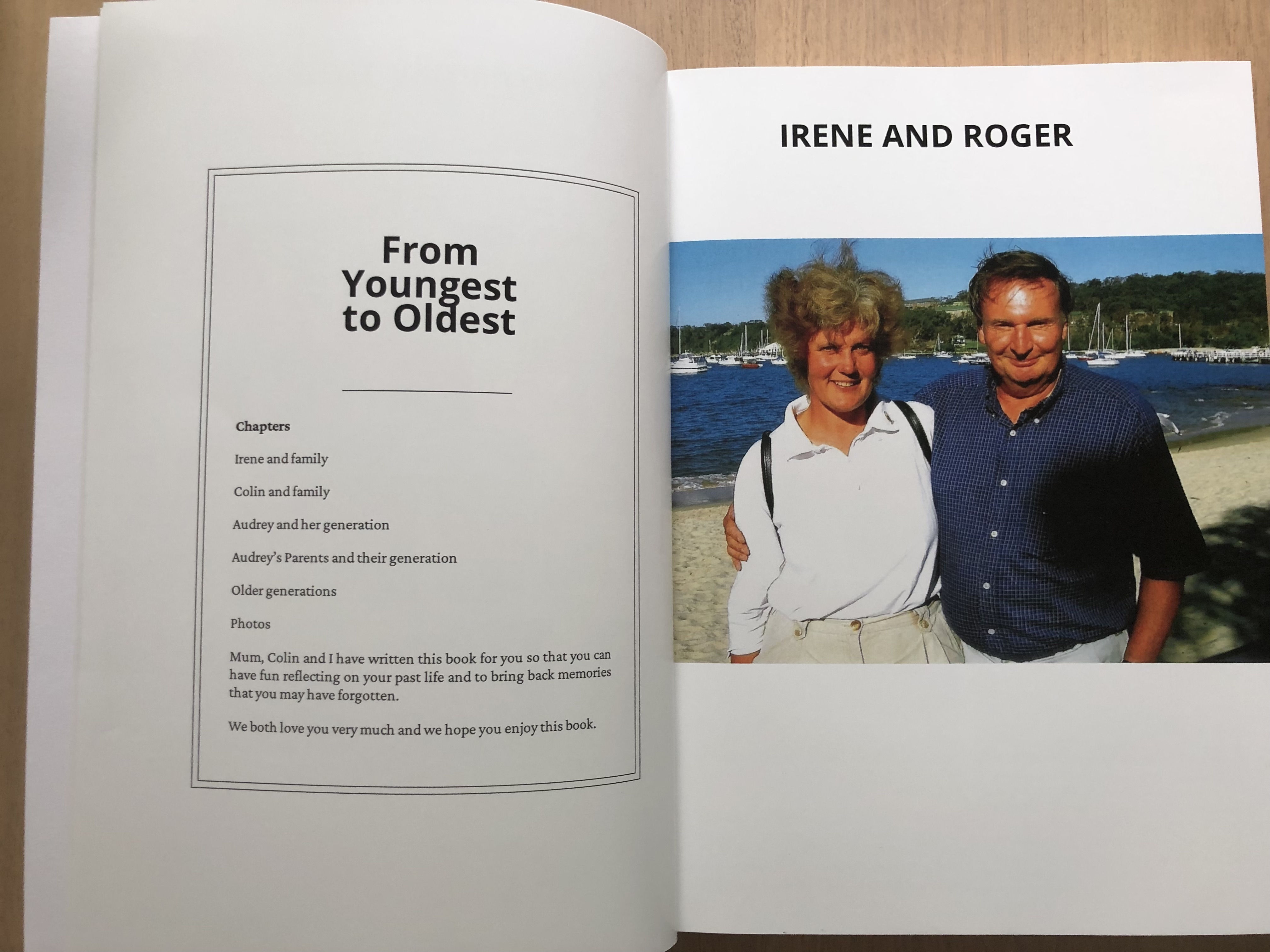 By the third book I’d worked out the errors and worked out ways to overcome them (apart from one). This book was a little different. My brother and I did it jointly – him from Switzerland and me from Australia. Due to the lockdowns, the inability to enter Australia and my mother’s age we were finding that she was losing her place in the world and who was in her world so we decided that we would write her a book that explained who everyone was, what their relationship to her was and be full of photographs of her interacting with these people. We were going to give it to her for Christmas but luckily I sensed I should give it to her earlier. I gave it to her two weeks before she died and she got so much joy out of it I am so glad that I did. Had I waited until Christmas she wouldn’t have had that pleasure.